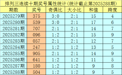 上期回来:陈设三第2025288期奖号:504。类型:组六,奇偶方式:奇偶偶,大小方式:大小小,和值:9,跨度:5。