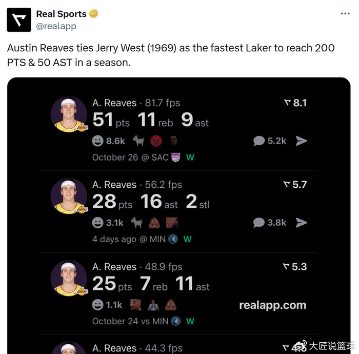 这亦然里夫斯开季于今火热弘扬的缩影,开季仅消耗7场比赛,里夫斯也曾拿到进步200分50次助攻,告成追平杰里-韦斯特(1969年)并排湖东说念主队史第一。